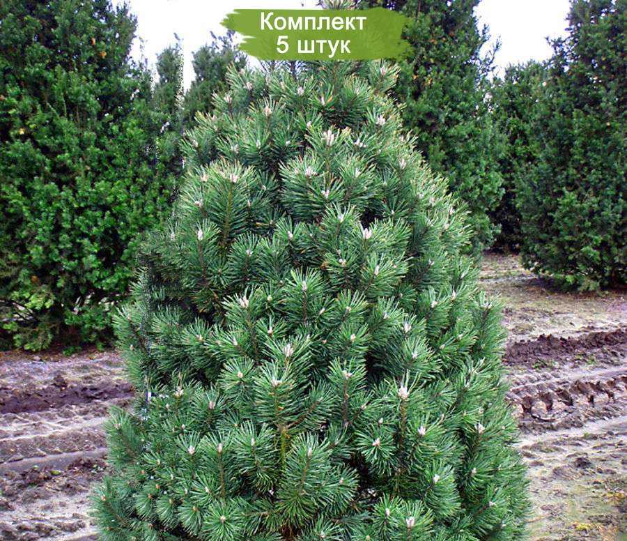 Приобретите комплект из 5 саженцев сосны горной (Pinus mugo), каждый из которых достигает в высоту от 150 см. Эти великолепные саженцы идеально подходят для создания живописных ландшафтов, укрепления склонов и декоративного озеленения территорий. Сосна горная известна своей устойчивостью к засухе и морозам, что делает её отличным выбором для различных климатических условий.